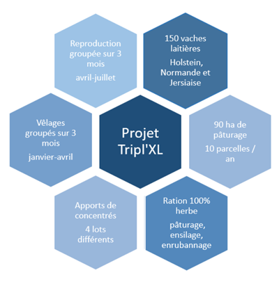 Le pâturage est un enjeu fort de l’élevage : il répond aux attentes sociétales, il favorise la biodiversité mais il peut aussi être contraint aux aléas climatiques. Le projet Tripl’XL a pour ambition de faciliter la mise en place de systèmes pâturant pour des grands troupeaux en (i) caractérisant le bien-être et la santé des animaux et (ii) en évaluant le(s) profil(s) de vaches adaptées à ce système.
